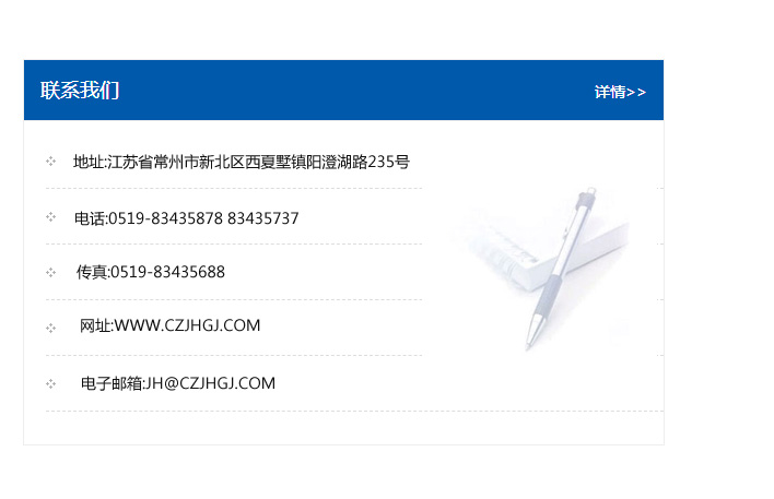 地址:常州市新北區(qū)友邦商務(wù)大廈1幢16、17層  電話:0519-85101652  傳真:0519-85112595  郵編:213022  網(wǎng)址:www.cz-jiayue_cn.dsfwl56.com  郵箱:xiajifengaa@163.com